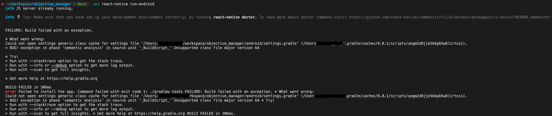 > 자바버전과 gradle 버전이 안 맞을 때 발생하는 이슈, ./android/gradle/wrapper/gradle-wrapper.properties 파일을 수정하여 해결함