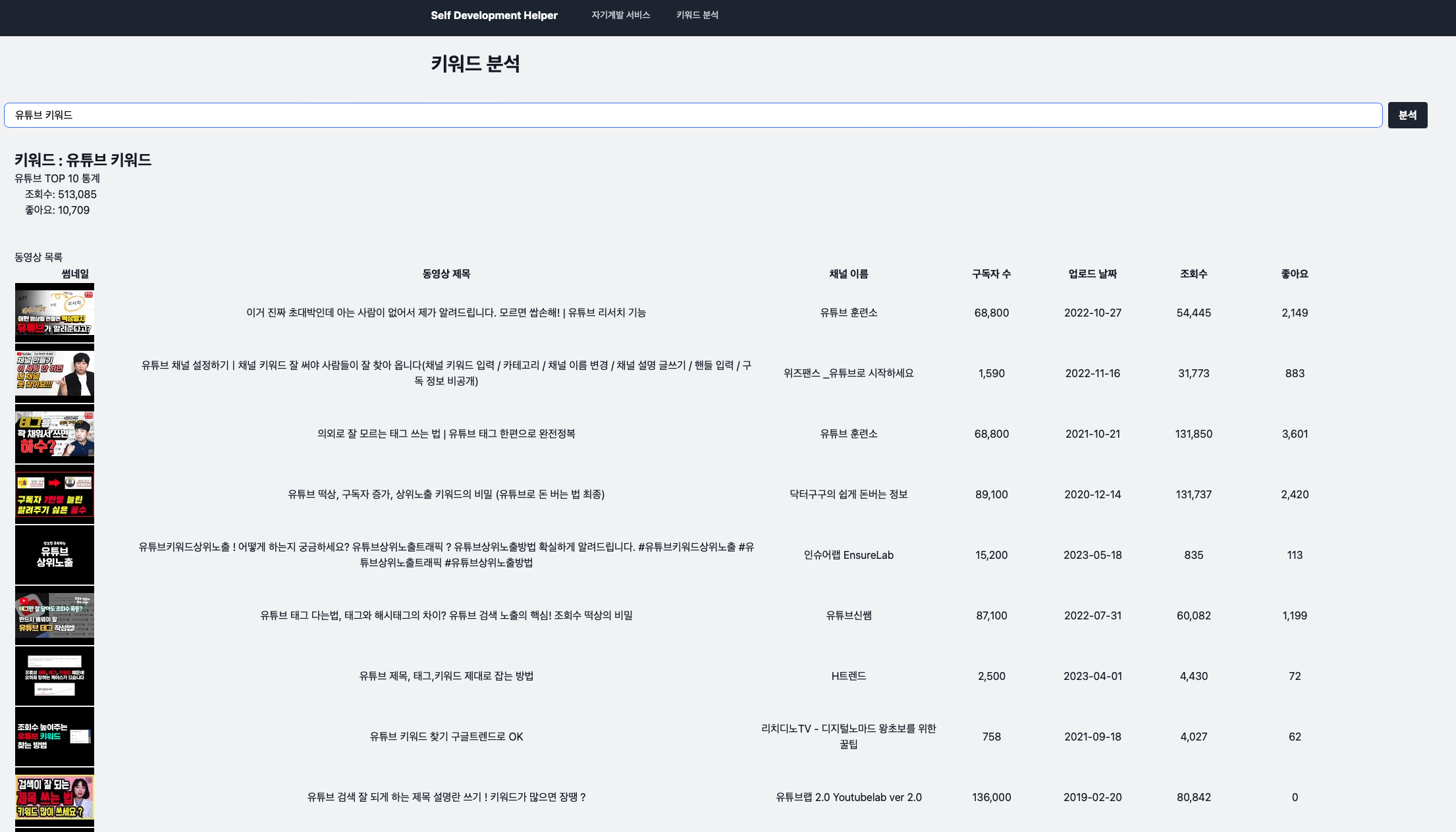 유튜브 키워드 분석, 채널 분석 등을 하는 서비스